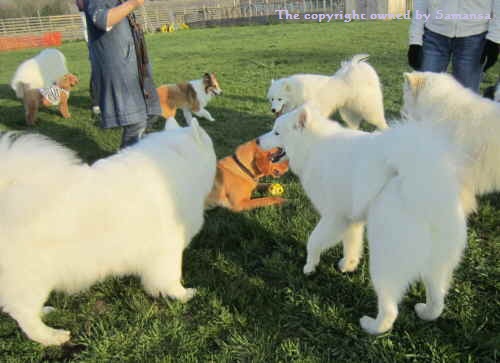 仲良しのサモ組ワン達に囲まれるジュピ太