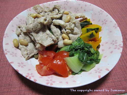 豚肉、かぼちゃ、青梗菜、トマト、茹で大豆