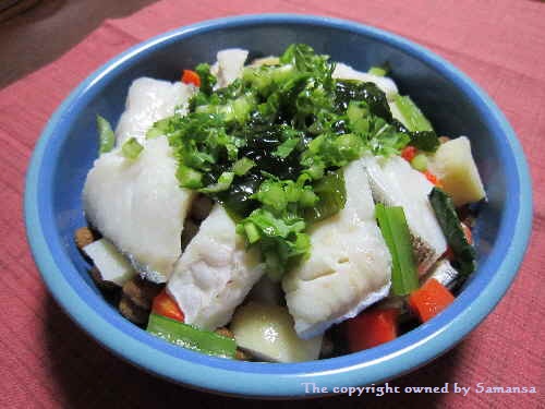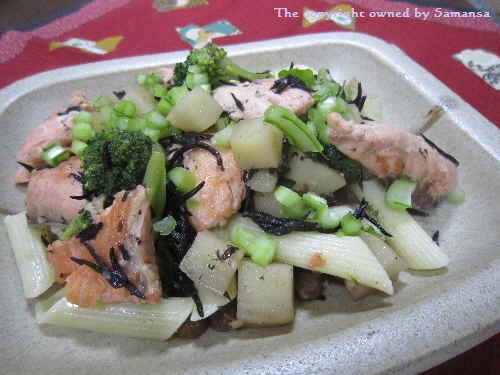 鮭、じゃがいも、ブロッコリー、ひじき、カブの葉
