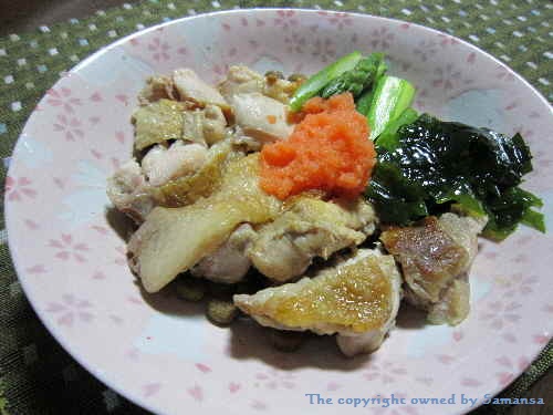 鶏もも肉、アスパラガス、人参、ワカメ、えごま油