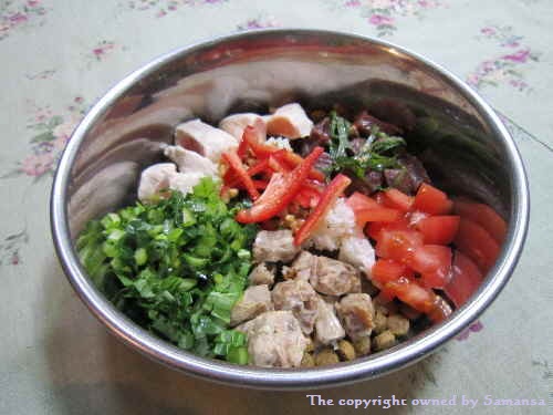 馬肉、ささみ、鶏首軟骨(市販品)、トマト、小松菜