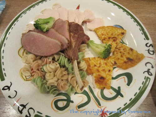 ラムチョップ・ターキー・チキン・パスタ・ブロッコリー・パンケーキ