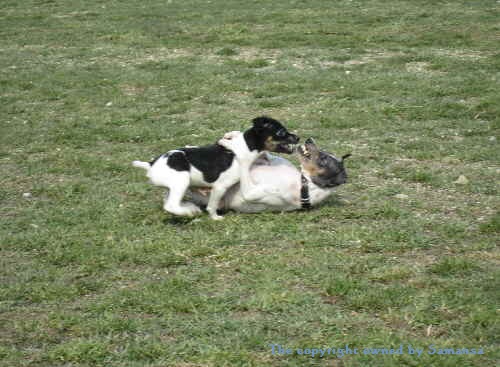 ジャックラッセルのボノくんとボールを取り合い